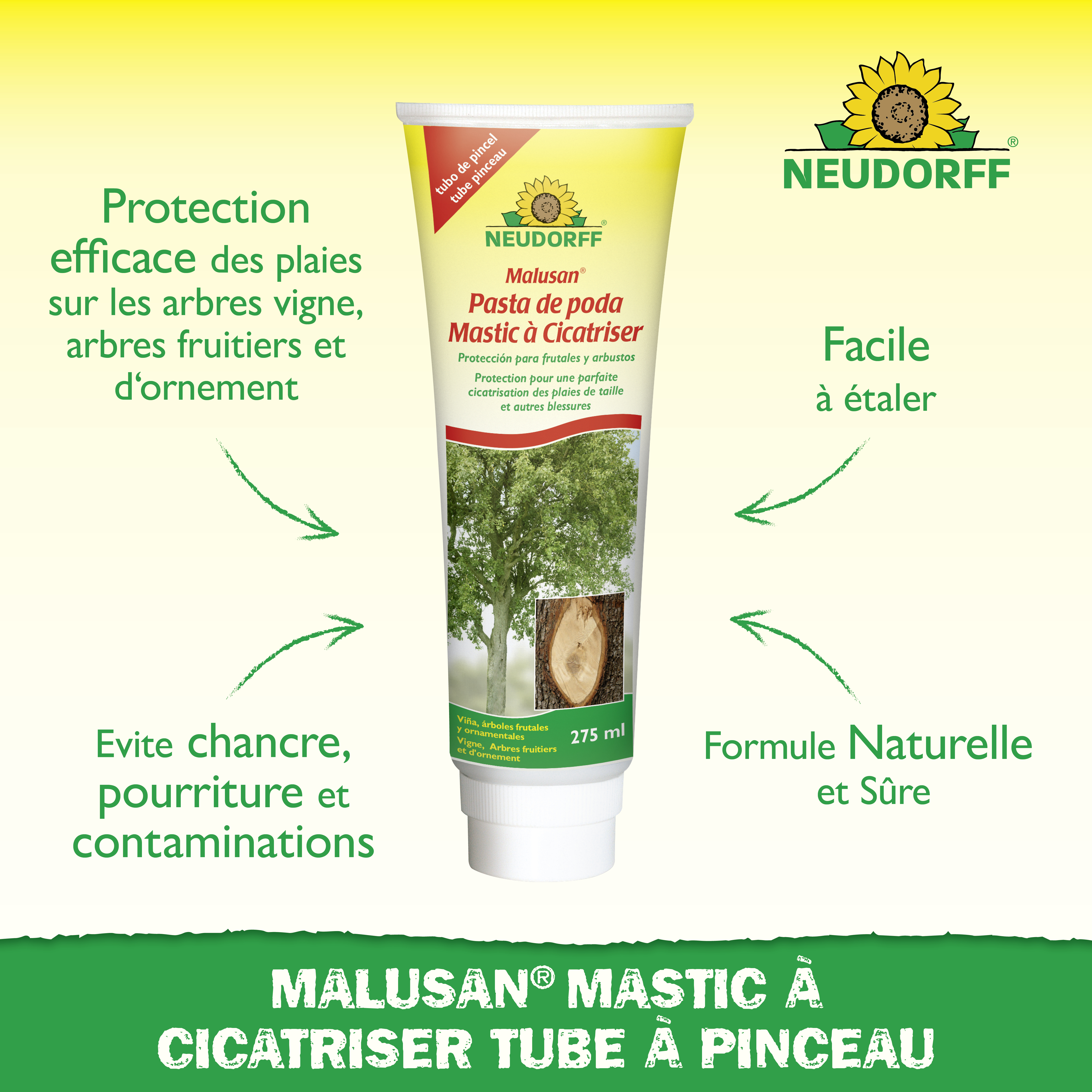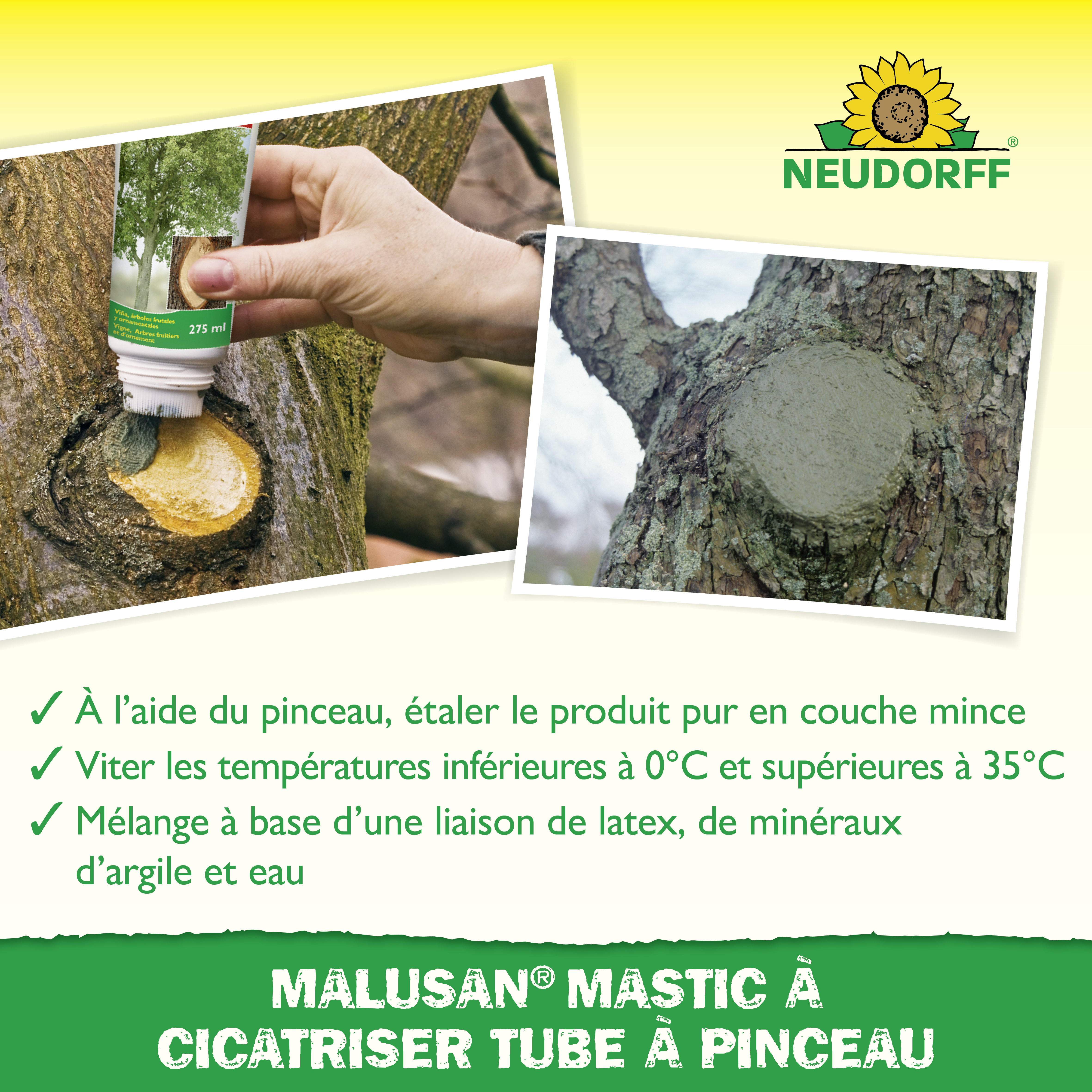 Le Mastic à cicatriser Neudorff s’utilise après la taille. Son utilisation peut s’effectuer tout au long de l’année en fonction des besoins. Le produit est prêt à l’emploi et ne doit pas être réchauffé. À l’aide du pinceau, étaler le produit pur en couche mince. Éviter les températures inférieures à 0°C et supérieures à 35°C. Le nettoyage peut se faire avec de l’eau chaude tant que la tâche n’est pas encore séchée.